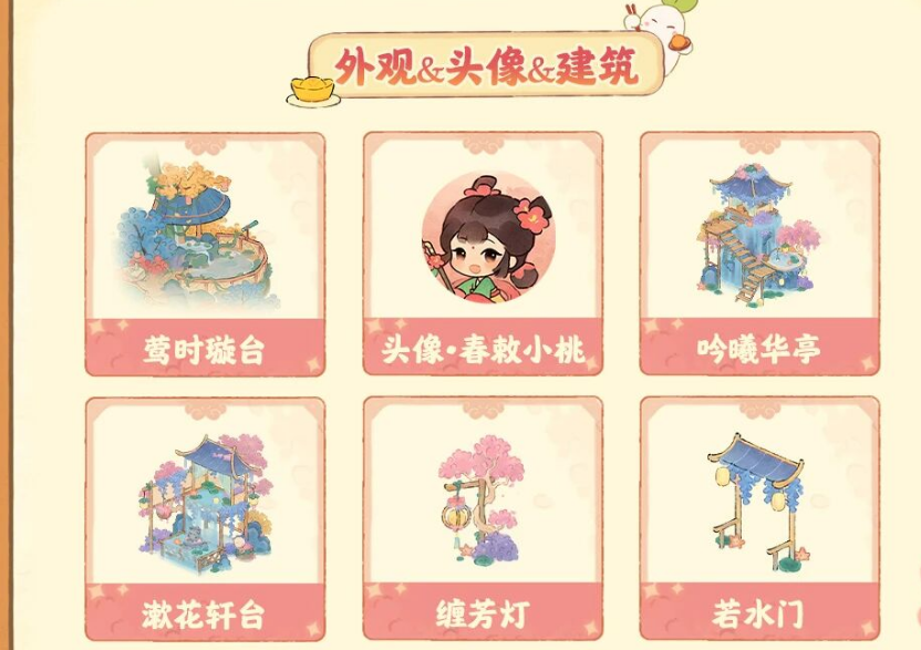 在返场兑换商店中,玩家可兑换的外观、头像、建筑有:莺时璇台、头像·春敕小桃、吟曦华亭、漱花轩台、缠芳灯、若水门。