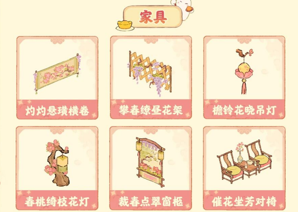 可获得的家具有:灼灼悬璜横卷、攀春缭昼花架、檐铃花晓吊灯、春桃绮枝花灯、裁春点翠窗柩、催花坐芳对椅、清颜怜芳花架、绒蕊花惜软垫、桃醉春浓盆栽、茜桃红露花篮、云攒蛱蝶花瓶、绮绣花信小凳、栖春画翠叠柜、绽妍抛春楼屏、明挽绡帐屏门、绾春渡叶屏风、桃醉藤麻长毯。