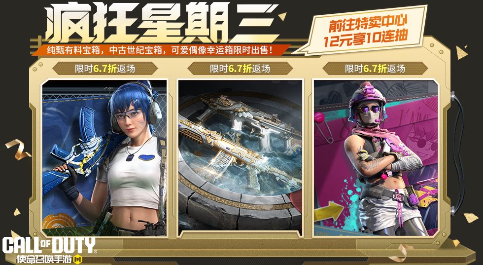 3月4日,疯狂星期三活动再度开启,本返场的三个高人气宝箱分别是纯甄有料宝箱、中古世纪宝箱和可爱偶像幸运箱。活动期间,玩家将享受6.7折的超值福利优惠。本次返场的三个宝箱各拥有一次特惠十连抽体验,玩家前往“特卖中心”,花费12软妹币即可十连抽一次!