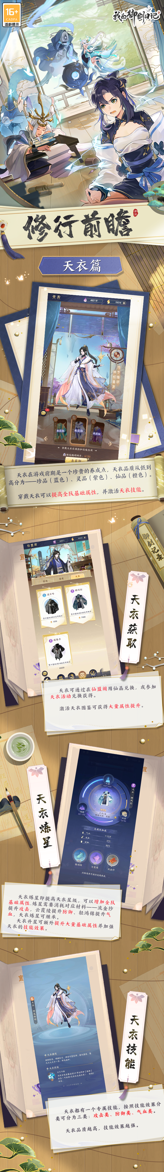 天衣可通过在仙盟阁或天衣活动中兑换获得,品质从低到高分别为珍品(蓝色)、灵品(紫色)、仙品(橙色)。穿戴天衣可以提高全队基础属性,并激活天衣技能,激活天衣图鉴可获得大量属性提升。