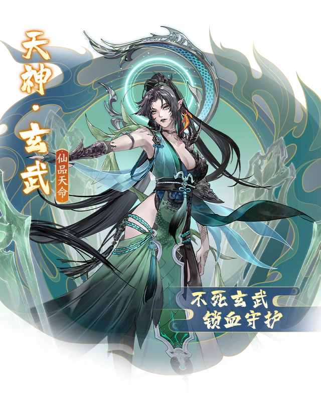 神通:为我方全体附加「玄印」状态,提高百分比防御,受到攻击时,玄武概率发动玄印诀:根据「中毒」状态数量与指定系数,对敌方攻击最高的3个单位造成高额伤害,同时恢复自身及我方气血最低单位的气血;