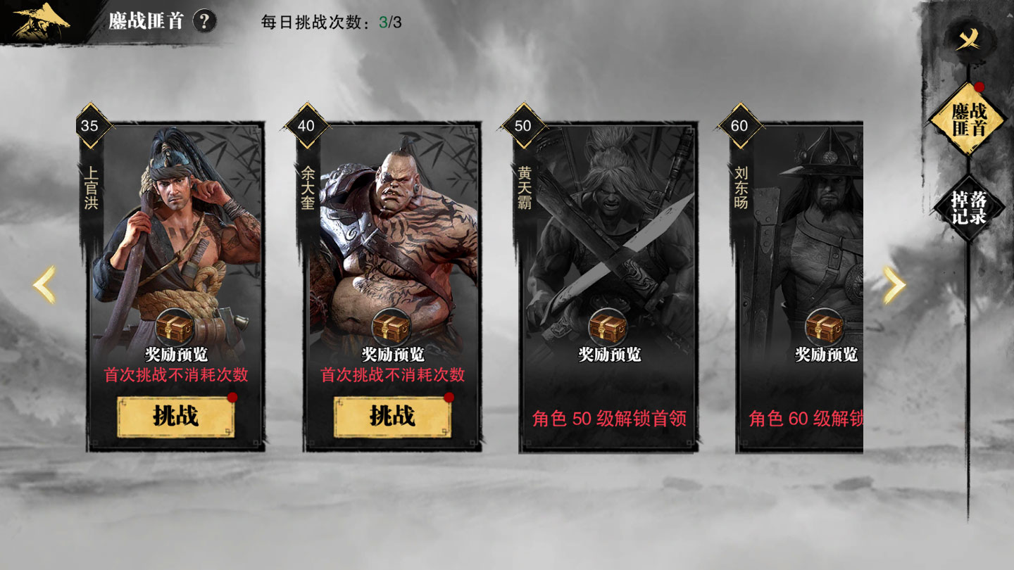 鏖战匪首为单人副本玩法,在限定时间内战胜首领,即为挑战成功,反之时间耗尽或被首领击杀,视为挑战失败,当然,失败之后还是可以继续挑战,挑战成功的大侠可以领取BOSS的击杀奖励,除了一些道具外,还可获得高等装备。