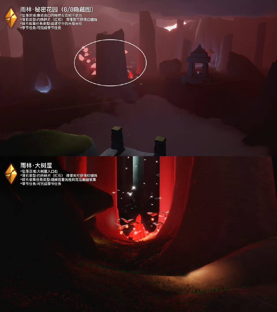 ✨按规律红石应降落在雨林8/8隐藏图,但由于该点位红石有bug无法完成清理,上次轮到这个点位时临时改去了【大树屋】,官方承诺过将在后续版本修复Bug。目前不确定该bug是否已被修复,因此不确定当天落石到底会出现在哪个点位,辛苦大家两边看看。请注意,两个点位的【红石出现时间也不一样】,不要找错了。