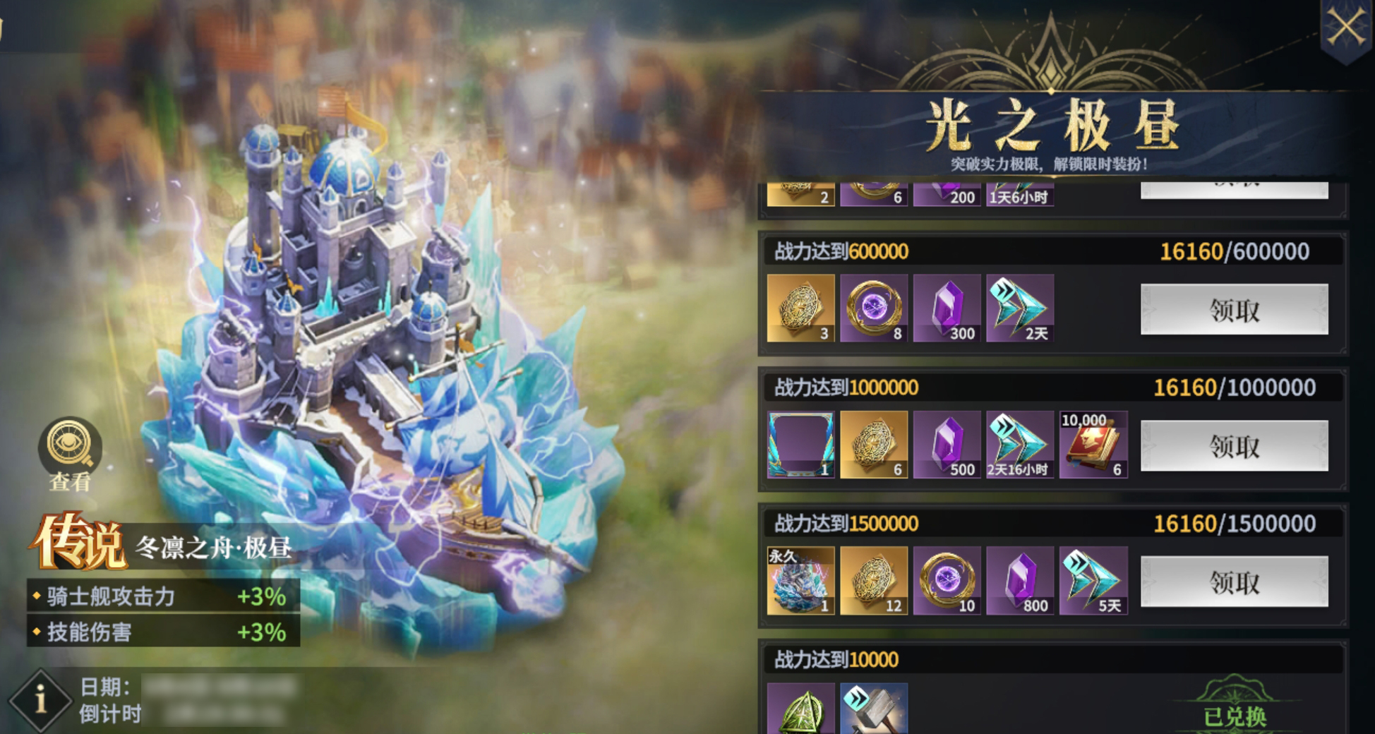 战力冲刺领超酷炫永久传说装扮—冬凛之舟·极昼!活动期间只需战力达标,就能领取远古达布隆币、紫钻、永久传说装扮等超丰厚奖励!再次强调:不看排名,达标就送!