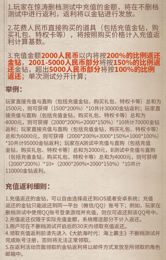 测试期间,提督充值的金额,将在不删档测试中进行返利(返利将以金钻进行发放)!