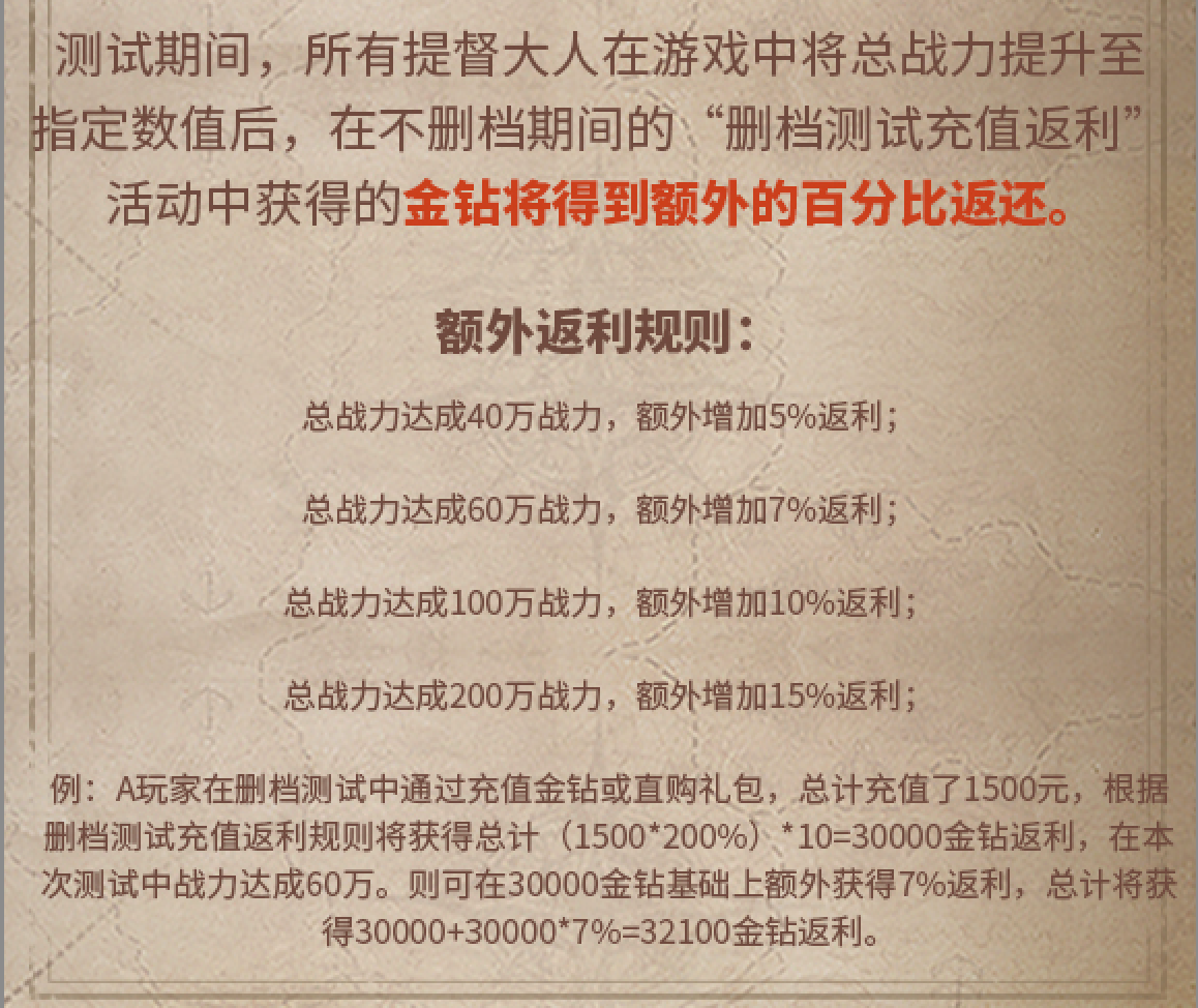 测试期间,提督在游戏中将总战力提升至指定数值后,在不删档期间的“删档测试充值返利”活动中获得的总金钻将得到额外的百分比返还,额外最高可增加15%返利。换言之,单人最高可获得215%充值返利!