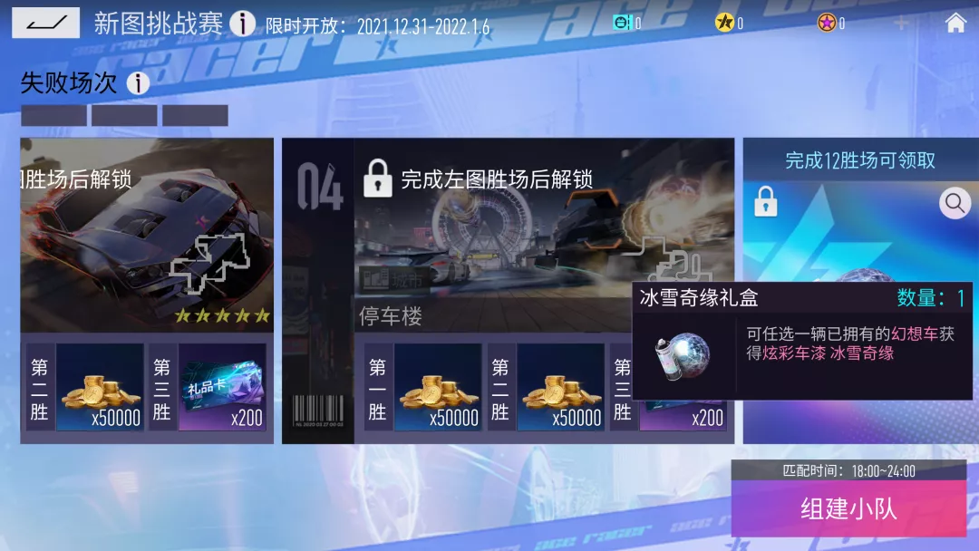 S5新图挑战赛将于2021年12月31日-2022年1月6日每晚18:00-24:00限时开启限时开启,持续7天。参与新图挑战赛并胜利可以获得大量的奖励,12胜的车手还可以获得绝版的炫彩车漆1份(仅幻想阵营车辆适用),走过路过不要错过喔~