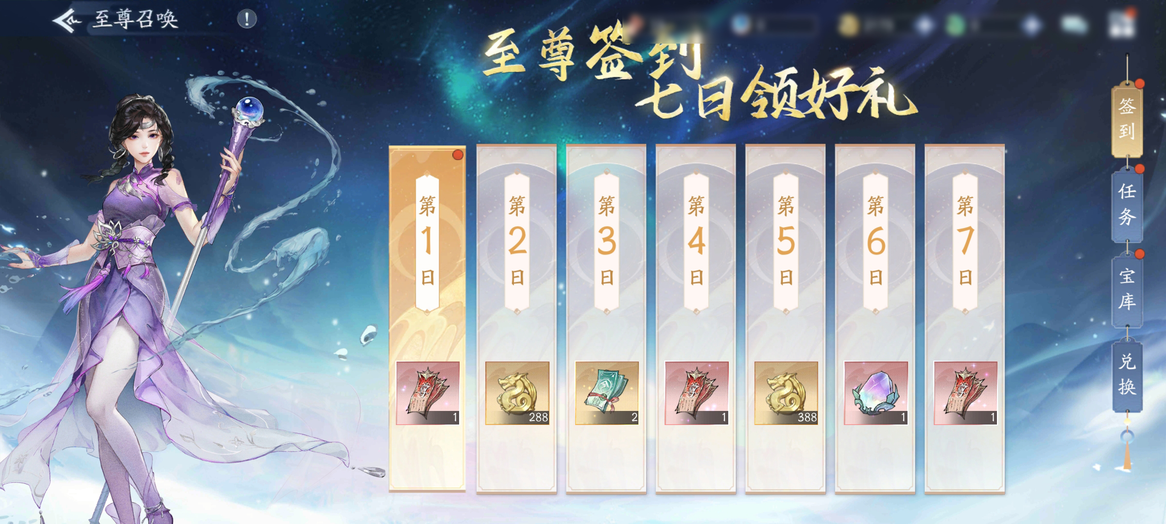 每日登录可领取签到奖励,累计七日共可获得至尊召唤券*3、金龙*678、祈愿符*2、五系招募石*1!