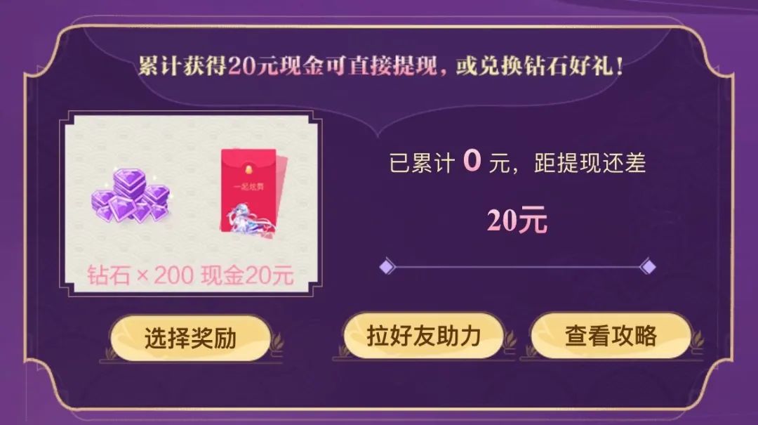 首次绑定角色必得15元哦!继续邀请好友助力,每邀请一个新注册玩家或老玩家累计1元,并赠送1个随机口味的月饼,累计获得20元现金即可直接提现,或兑换200钻石好礼!