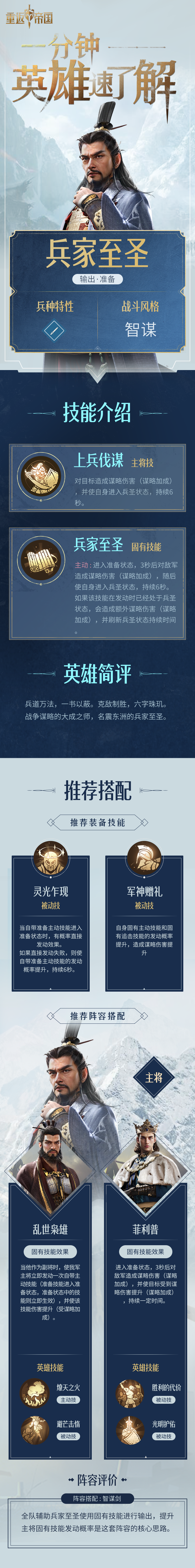 【兵家至圣】的主要特点是输出、准备,推荐搭配技能【灵光乍现】+【军神赠礼】,可以和英雄【菲利普】+【乱世枭雄】搭配,以【兵家至圣】作为主将。