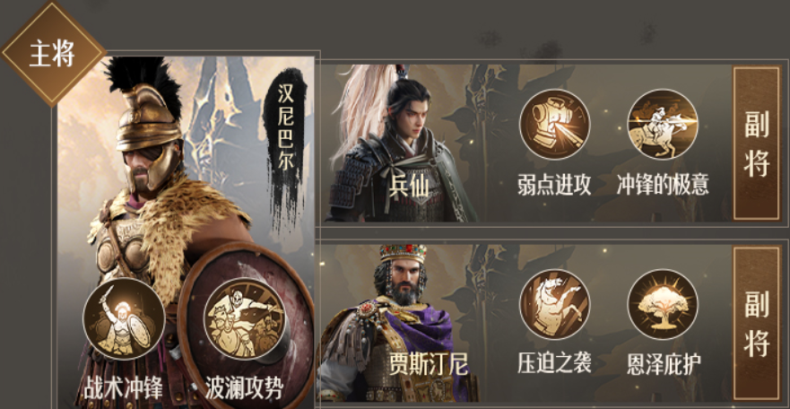 配将上,贾斯汀尼作为副将,主将选择汉尼巴尔,副将再搭配一个兵仙。