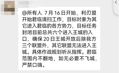7月15日君临局势大洗牌,事情的起因就是【利刃】联盟在群里发布一条公告,将于16日开始清扫所有敌对势力,把控进入王城的各个关口,在20日王城开放后,第一时间集火占领王城。而本次事件所涉及的【狼骑】和【orc】联盟均在此前放话,表示不入王城。