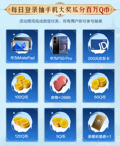 活动期间完成指定任务,还可参与百万Q币抽奖池!MatePad平板电脑、P50 Pro高端手机、200元京东卡等大奖等你来拿!