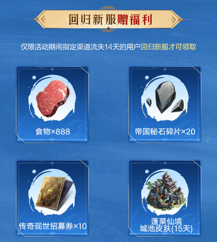 回归领主前往新服,即可领取限定皮肤、资源礼包等回归福利,开局领先,驰骋帝国!