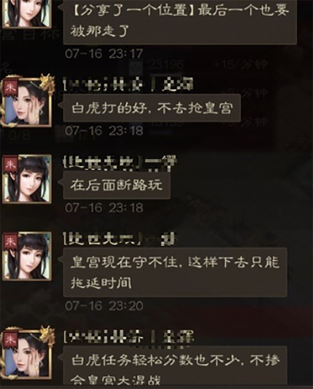 12服白虎最开始是弱势方,在三家联合讨伐朱雀后,战术性的放弃了皇宫大混战。