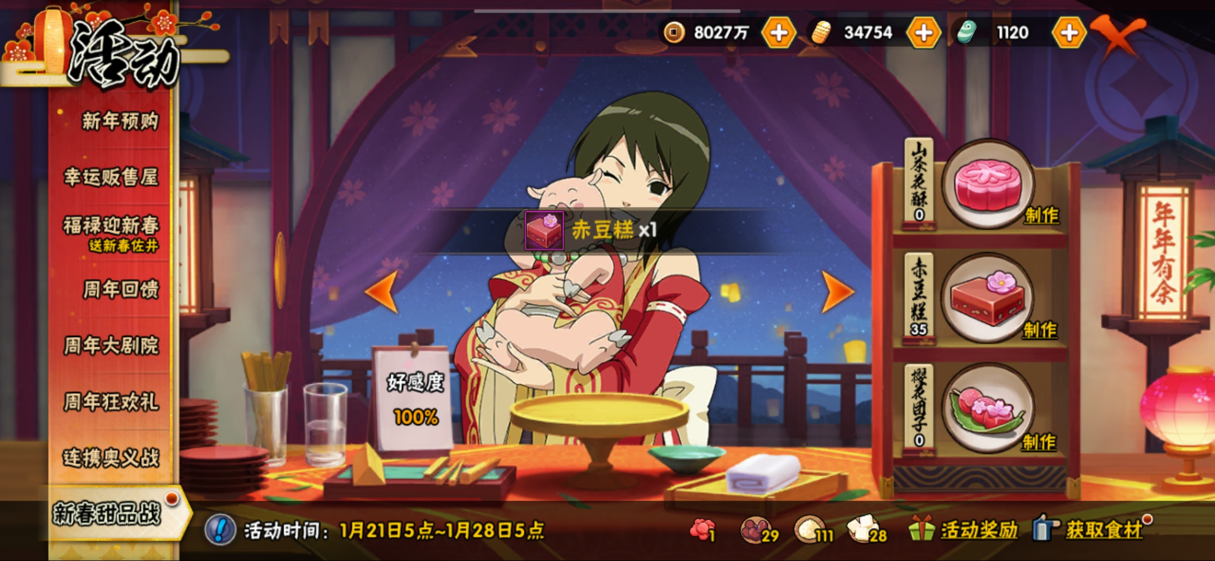 还是跟以往一样,我们先看一下这个活动的具体规则:在活动期间,参与任务集会所,冒险副本、小队突袭可分别收集新春的专属食材红豆、面粉、糖块;其中有一个材料是山茶花,可以参与新春甜品战与雏田-同争夺山茶花,玩家将以特定比例获得食材山茶花瓣,消耗金币可获得3倍结算奖励。单局拾取山茶花数奖励以及新春甜品战挑战次数每日5点刷新;.制作各类甜品送给喜爱的忍者,可收获奖励并积累忍者的好感度,不同忍者的喜好也各有不同的好感度;在当忍者好感度满100时,玩家可获得独特的好感奖励!当然每种甜品拥有一致的合成配方:山茶花瓣×4+红豆×4+面粉×6+糖块×4。