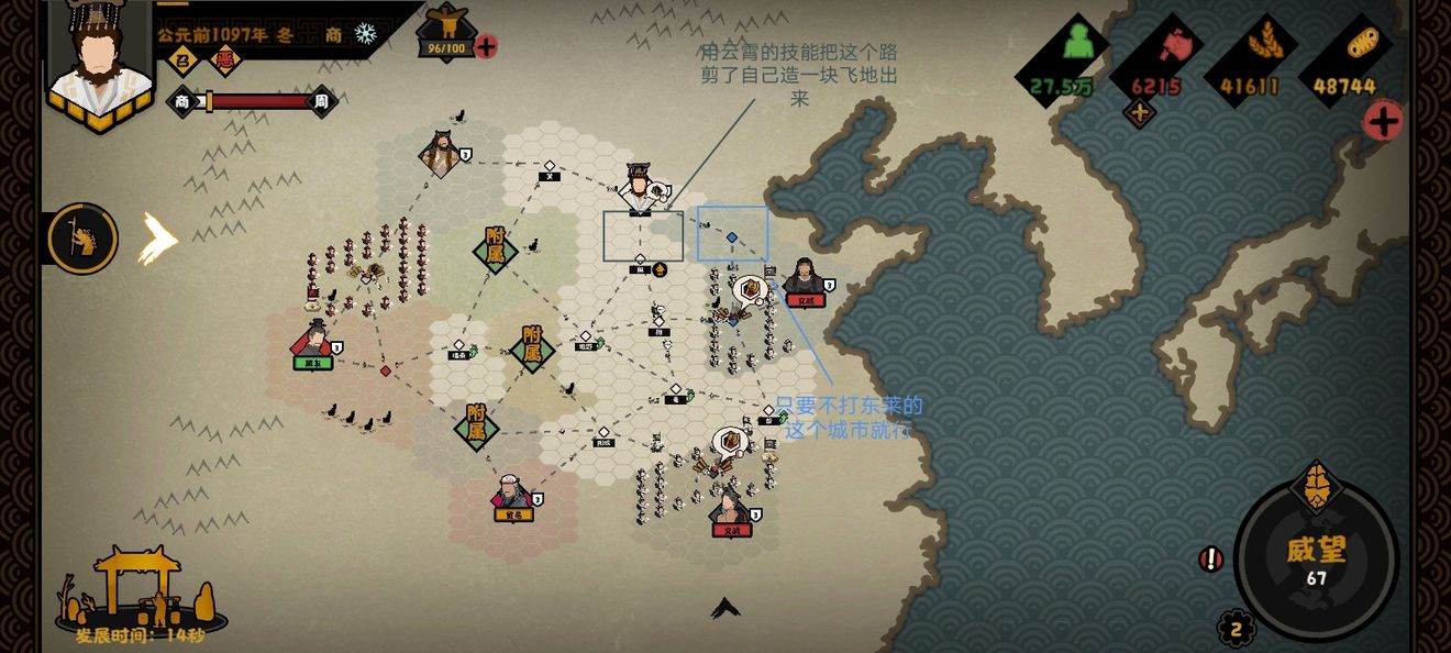 首先占卜出入梦,然后存档sl刷(这是想要姜尚的朋友要干的,有的就不用看了)接下来如果还能占卜一两次最好刷出来一次往来,一次+15好感,周初始好感是50,一次就是65,两次就是80,直接联盟,夏商周还不能累战,外交行动力没什么用,几次就能联盟成功,白城可以全拿下来,接下来就是打东莱和夏(ps:这两个国家有时候被打下一个城市可能会臣服,就不用打那个臣服的了,我推荐是把东莱打臣服有张良buff加成很快就能打下夏),然后和周共伐再打鬼方、荆楚(这个家伙不会发育,直接打就行)