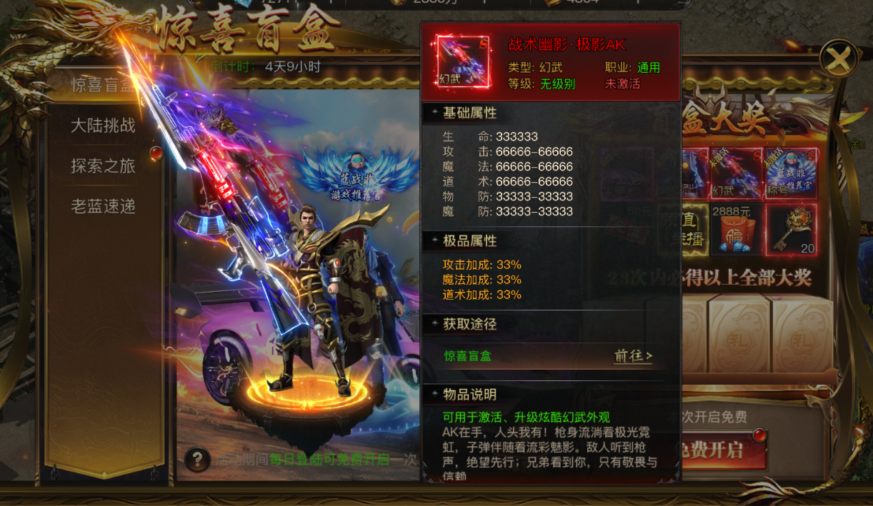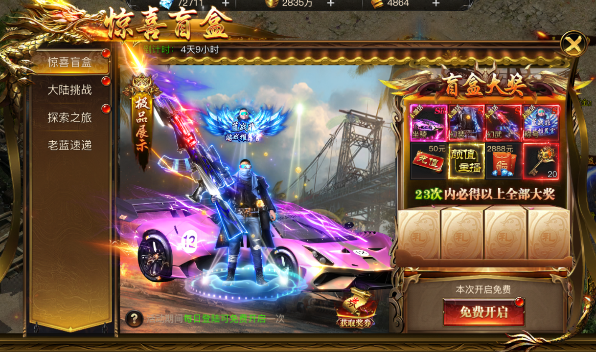 1、每日首次登录即可获得一次免费开启,之后抽奖需消耗盲盒抽奖卷,该道具可通过活动大陆挑战、探索之旅获得!