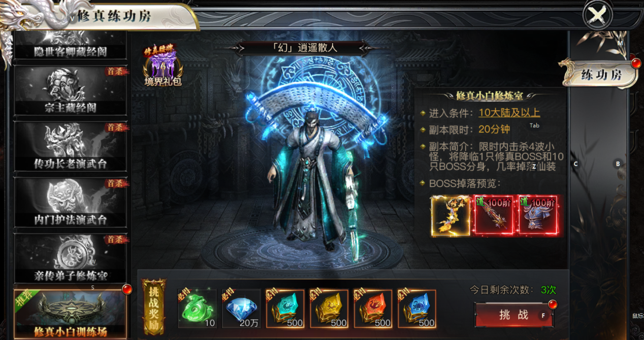 副本挑战:单人可闯“练功房”,刷取海量钻石和道具,给装备升级;有概率爆出高手装备,每天三次,每日必做副本!