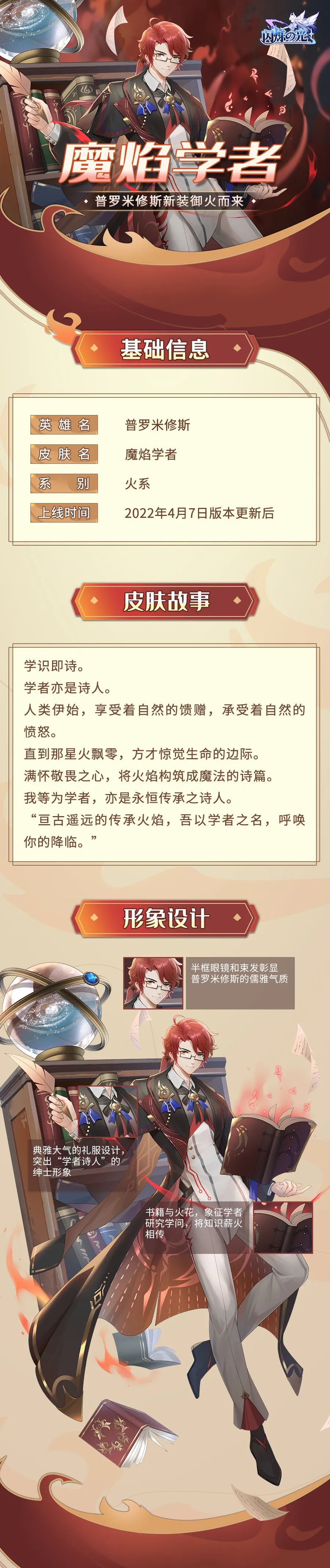 集渊博学识和狂暴魔焰为一身的普罗米修斯新装【魔焰学者】将在4月7日的版本更新中与大家见面啦!