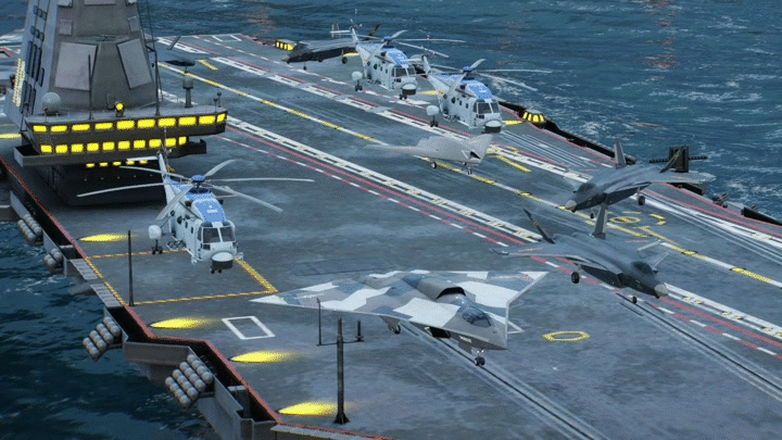游戏中,003福建舰初始配置就包括FC-31(J-35原型机),同时极具创造性的标配我国另一款五代机J-20。两款战机可同时起飞协同作战,其搭载的强大作战武器可完成反舰反潜制空等一系列任务。在后续换装中,甚至可以选择J-36、J-50等最新六代机,进一步提升战斗能力