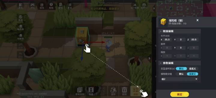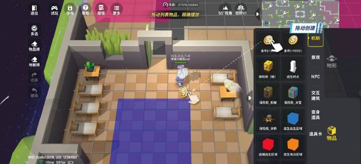 少年们可以通过拖拽或点击操作在地图中添加物品。除了可放置出生点、视野、金币与保险柜等游戏机制相关的物品外,还能放置景观、NPC、变身道具、道具卡等交互物品。