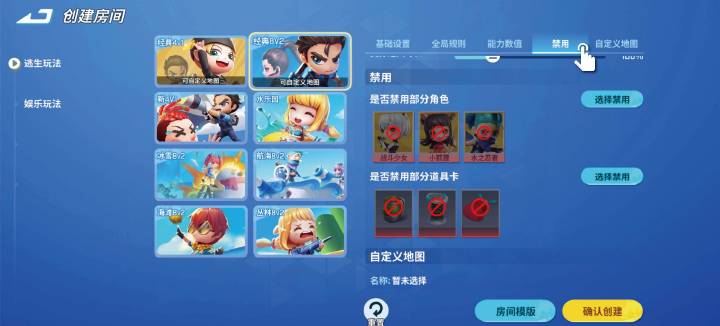 少年们可禁用指定的道具卡和角色。禁用后,对应角色将无法被选用(若已选中,则会被自动替换为默认角色);被禁用的道具卡也无法在局内使用。