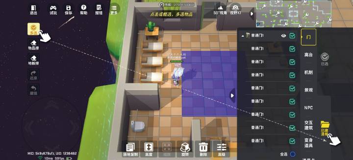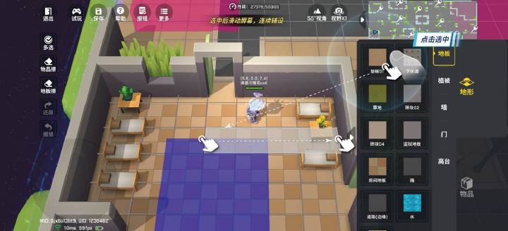在“地形”创建菜单中,少年们可以自由放置多种颜色与类型的地板、墙面、植被、门和高台等物品。简单滑动即可快速铺设地形,操作轻松简单。