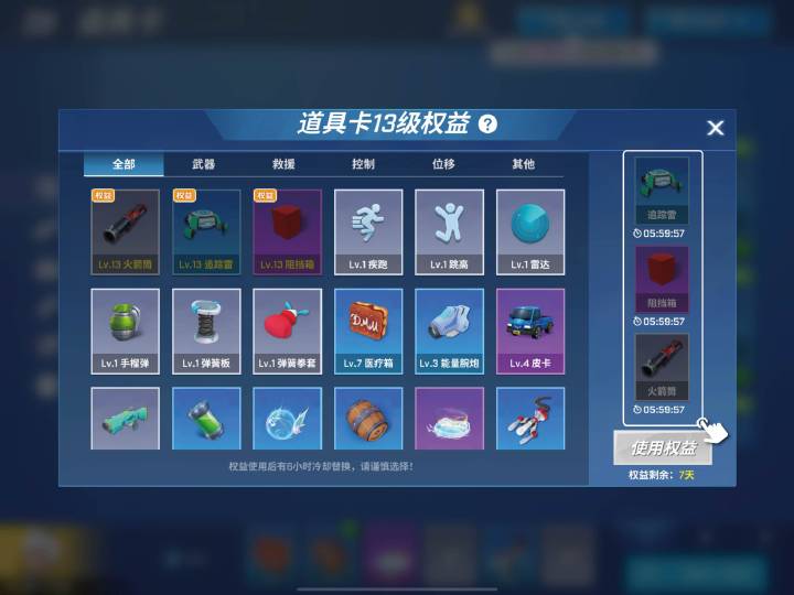 每次使用权益后需等待6小时冷却可更换其它道具卡!