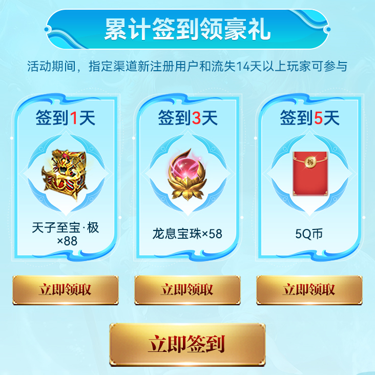 Q币、实物奖励周年再加磅,活动期间,新人、流失14天以上主公累计签到3日,还能领取天子至宝·极、龙息宝珠等福利。保证初期养成无忧。累计签到5日,还能再领5Q币红包!