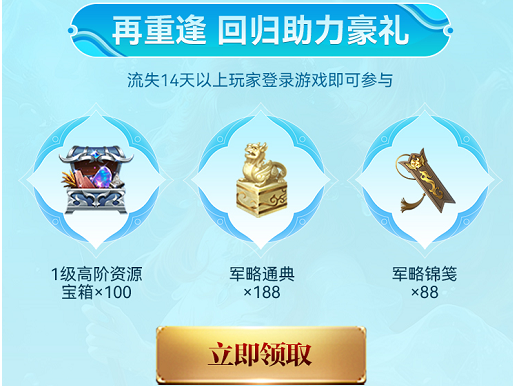 回归乱世福利加磅,流失14天以上的主公登录游戏即可领取5Q币,数量有限,先到先得!还有1级高阶资源宝箱*100、军略通典*188、军略锦笺*88三重升级奖励。多样50堡、军略福利助力实力追赶!