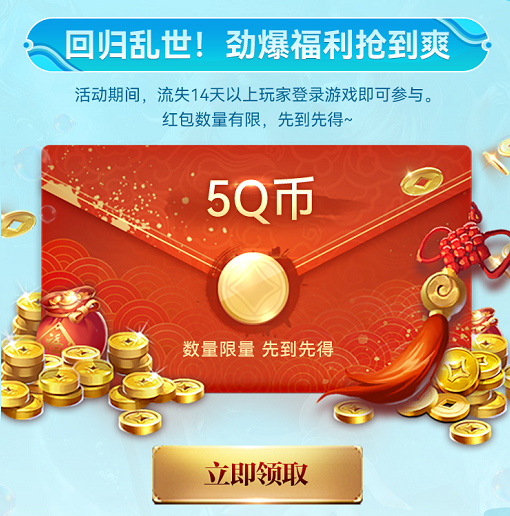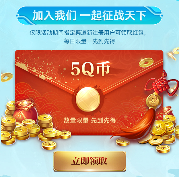 加入乱世就领Q币好礼!活动期间,指定渠道新注册主公登录乱世,即可领取5Q币红包,每日限量,先到先得!