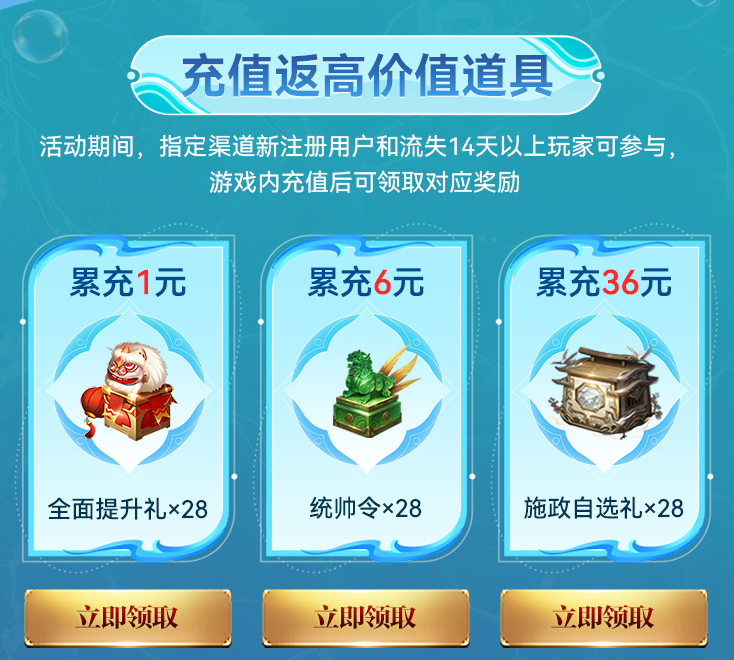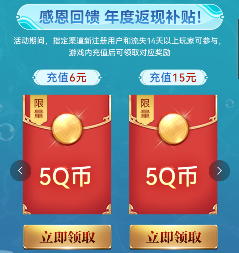 新人/回归主公特享感恩回馈,充值达标就领5Q币,总计可得10Q币年度返现补贴!叠加充值加磅,直接拉爆返利性价比!