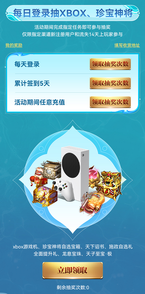 新人/流失14天以上主公完成累登、充值任务后,还可获取抽奖机会,赢取XBOX游戏机、珍宝神将自选、天下诏书等珍贵大奖!
