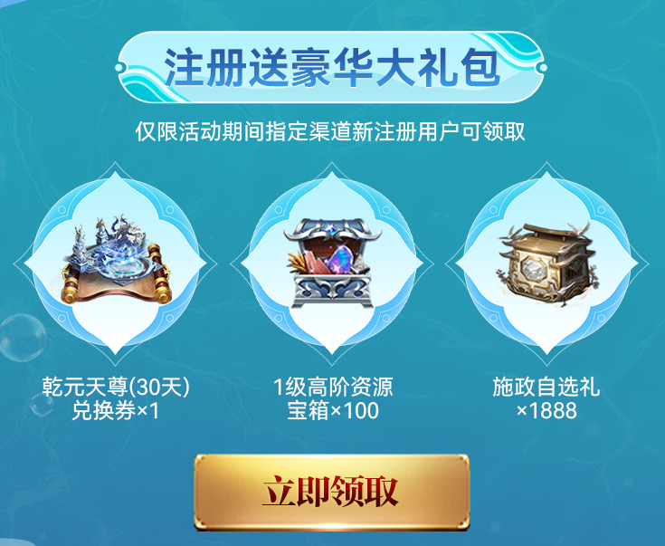 新人主公注册即送豪华礼包,内含乾元天尊(30天)限定装扮、1级高阶资源宝箱*100、施政自选礼*1888,50堡、施政养成一站式提升!