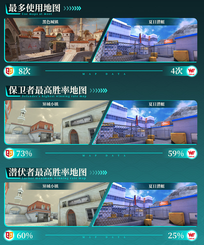 在地图方面,夏日潜艇成为WE的王牌地图。无论是在选择次数还是保卫者与潜伏者的胜率方面,夏日潜艇都有效的帮助WE得分。而反观Q9,黑色城镇成其首选地图,而助力Q9取胜的地图则是异域小镇。通过Q9的地图表现来看,显然Q9可在多幅地图内找到自己的节奏感,非单一的地图则成为Q9压制WE的关键。