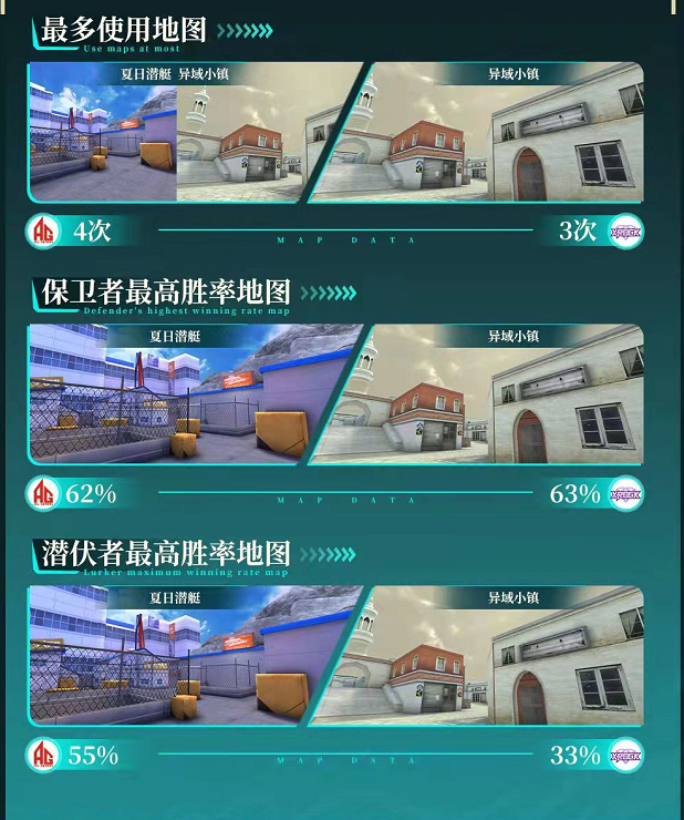 而在两支队伍的地图使用方面,两支队伍无论是在最多使用地图、还是保卫者以及潜伏者最高胜率地图中,两支队伍的地图都较为偏向单一地图。夏日潜艇将是AG取胜的法宝地图,而异域小镇则是炫石的王牌地图,这也意味着当两支队伍交手时,或将针对对方的主力地图做出调整,玩家们也或看到AG与炫石将对方的主力地图禁用的场面。