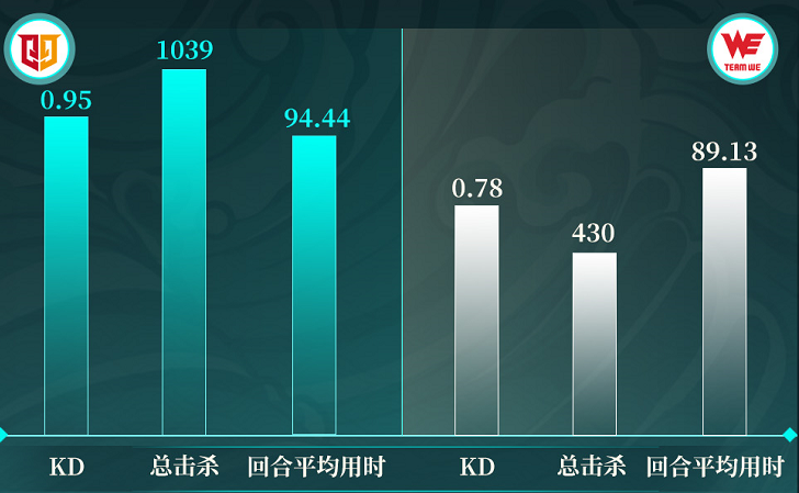 在战队的数据对比中,Q9在KD、总击杀以及回合用时方面优于WE的表现。这意味着,在比赛中,Q9的选手更容易击倒对手,帮助Q9在场上形成优势局面。而总击杀数据的差距更体现出Q9在面对WE时,更容易掌握比赛节奏的走向,较容易取胜。