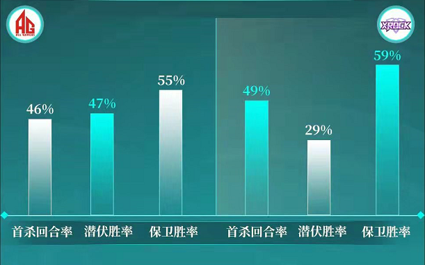 而在阵容胜率方面,显然潜伏者成为炫石的软肋,29%的胜率意味着炫石难以在潜伏者阵营抵抗对手的冲击。虽然AG的潜伏者胜率同样不足保卫者胜率,但是二者相差较小的胜率,也体现出AG在担任潜伏者时同样拥有取胜的可能性。