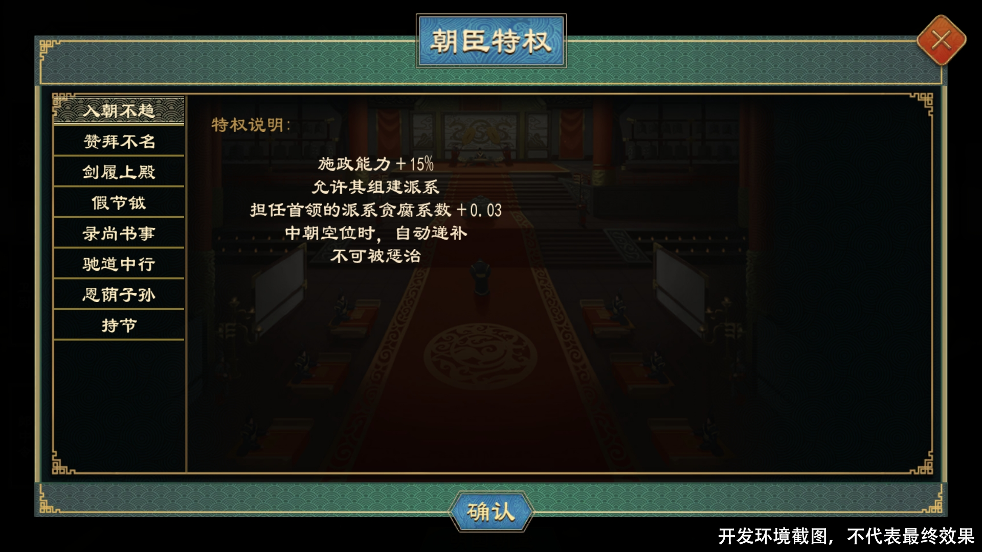 本次更新将带来“忠君派”“政见派”“谋身派” 三大派系。“忠君派”通常是特权的拥有者, 笃信 “君为臣纲”,誓死效忠君主;“政见派” 秉持 “道不同不相为谋”,以其主张的治国方针聚合;“谋身派” 奉行 “良禽择木而栖”,以个人利益为先。其中,三大派系并非固化不变,而是会随着朝堂权力更迭、治国方针改变等多种情况随之发生转化。