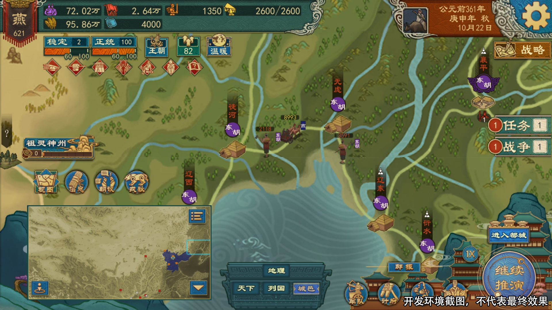 割据势力拥有专属的 “帷幄官制”,各职位可以影响军队的士气、纪律、生还率、行军速度等。