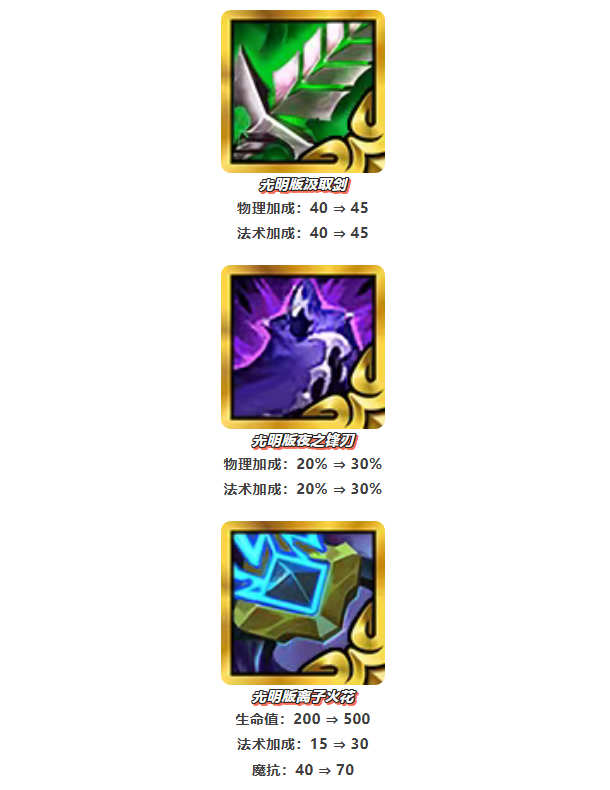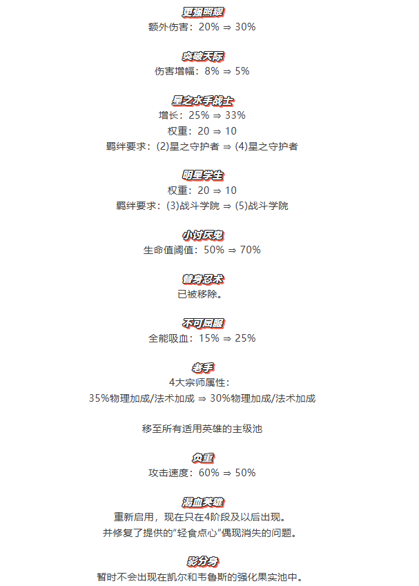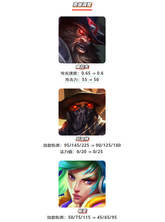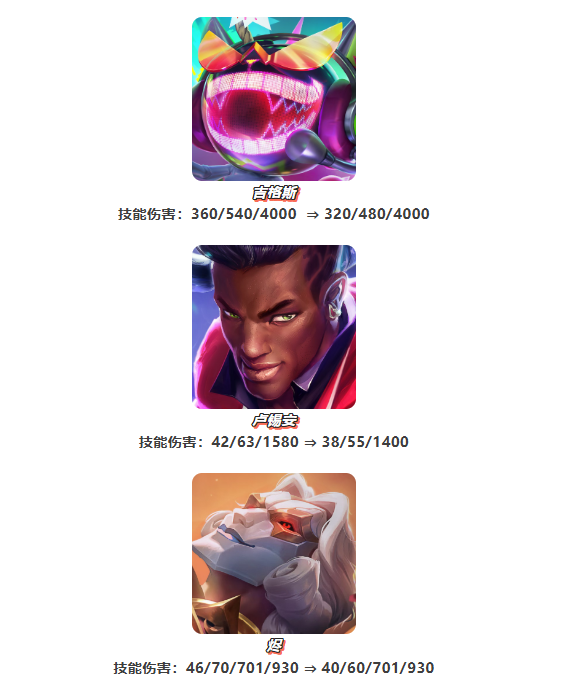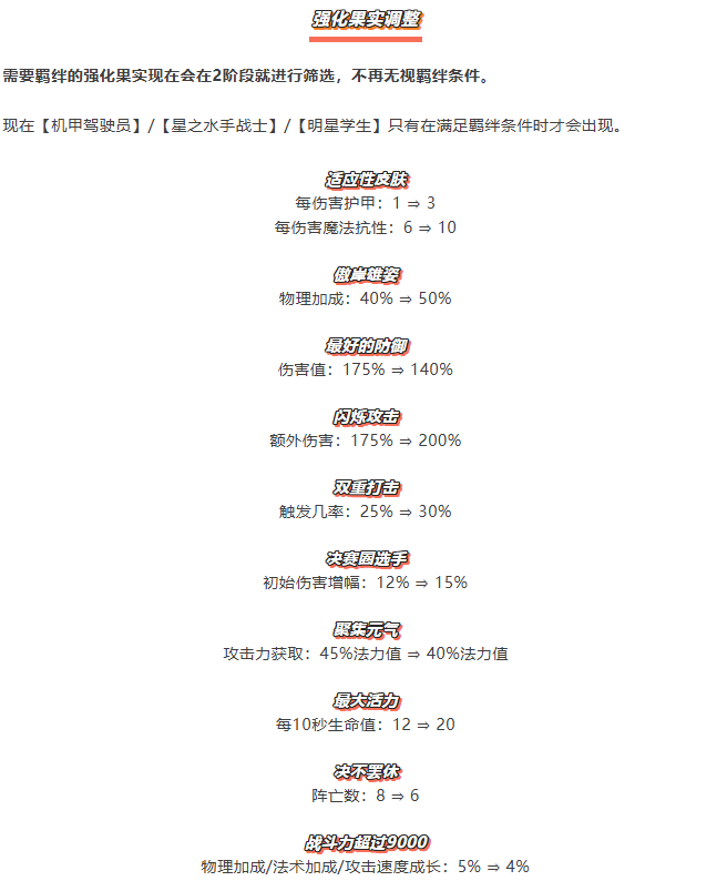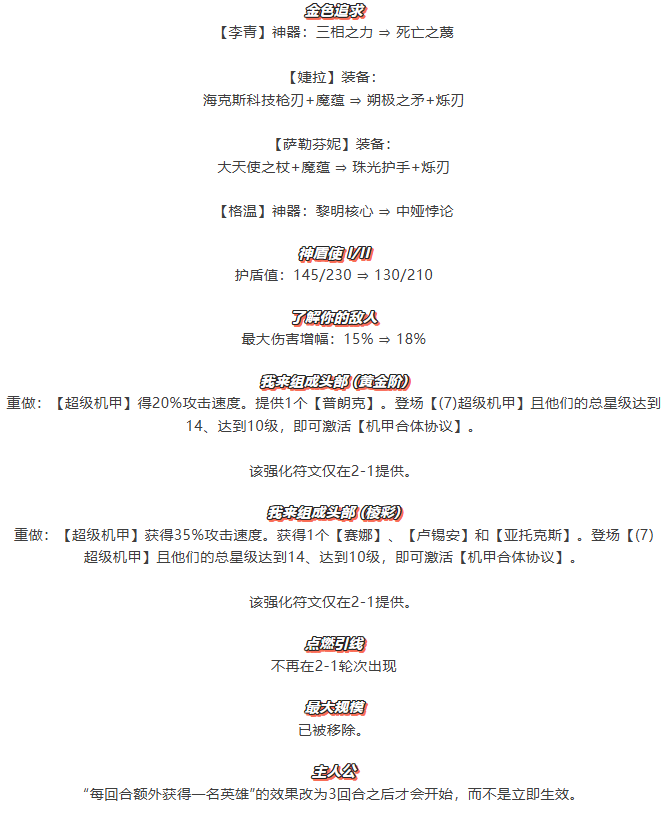 15.6版本中,我们针对【天下无双格斗大会】大大增强了5费弈子、削弱了部分羁绊、并加强了一些不够给力的C位。而【强音对决】整体战斗节奏偏快,在全面削弱的环境下我们小幅度提升了部分低费英雄的伤害,希望带来更舒适的对局环境。