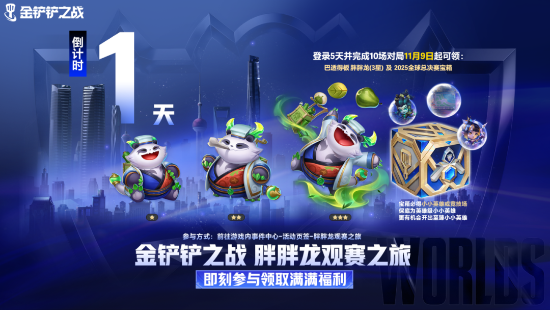 登录5天并完成10场对局(可提前完成任务),明天开始领取【巴适得板 胖胖龙】(3星)+2025全球总决赛宝箱,宝箱必得小小英雄或竞技场,保底为英雄级小小英雄,更有机会开出至臻小小英雄!满满福利,即刻参与吧!