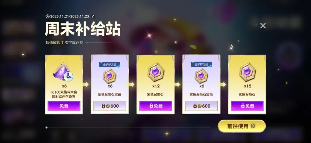在活动中600点券解锁极地聊天气泡体验卡(1天)*6,获赠紫色召唤石*6,即可免费领取紫色召唤石*12,可连续解锁2次。累计超值得7次宝库召唤机会~