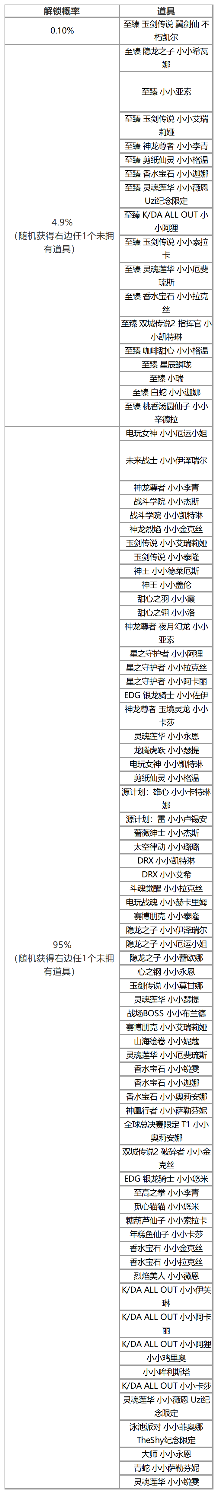 1)符文传说宝箱:开启后保底可得随机1款未拥有的神话级小小英雄,有机会解锁卓越级【至臻 玉剑传说 翼剑仙 不朽凯尔】。如果以下道具全部拥有,将获取60个英雄联盟传奇徽章盒。
