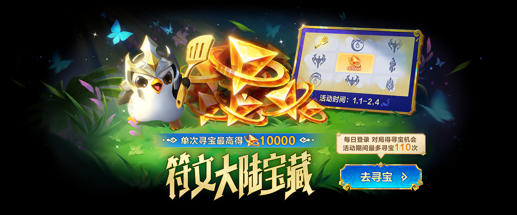 🌟1月1日-2月4日,每日登录&参与对局即可获取寻宝次数,1月15日&1月22日更有限时幸运任务,登录即送5次寻宝机会,单次最高可获得10000符石精粹!