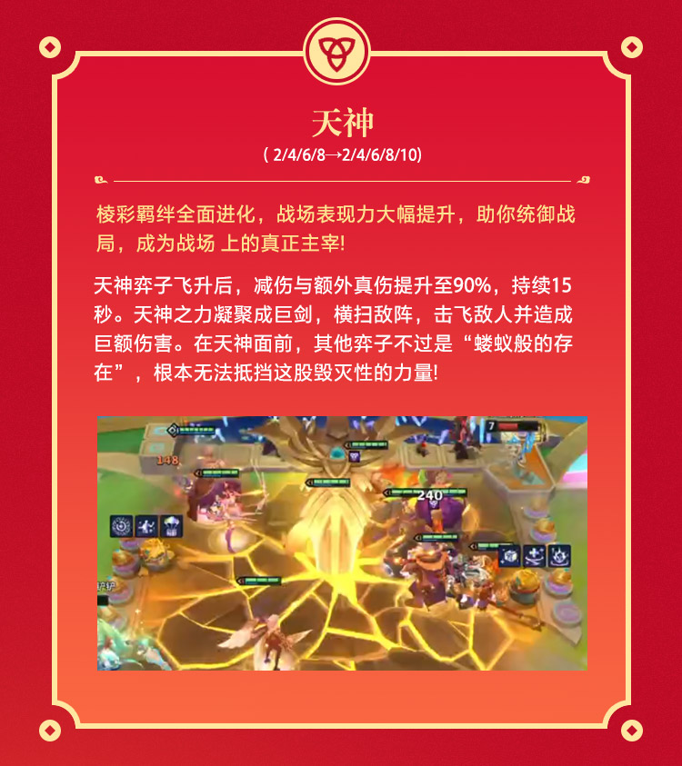 解锁福星传记,登场福星守护神。同时只能上阵一名【福星守护神】弈子,【福星守护神】弈子不会占用人口,也不会为羁绊贡献数量,但是他们可以从已激活的羁绊中获得增益。