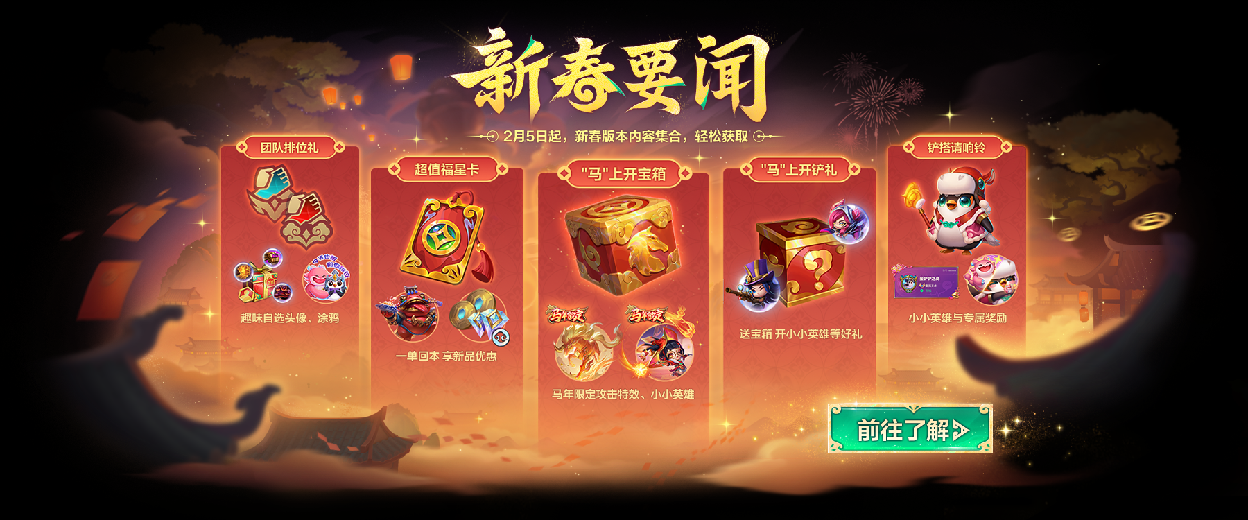 🎉新春佳节,五位小小英雄携五福气运降临金铲铲之战,为对局增添喜庆与好运!
