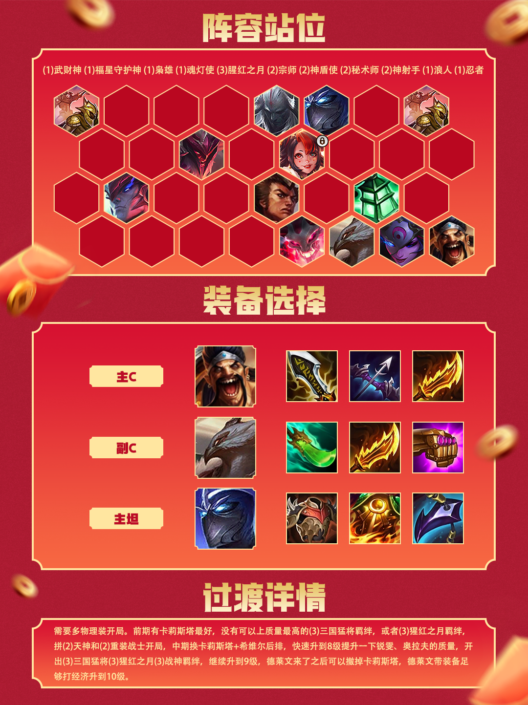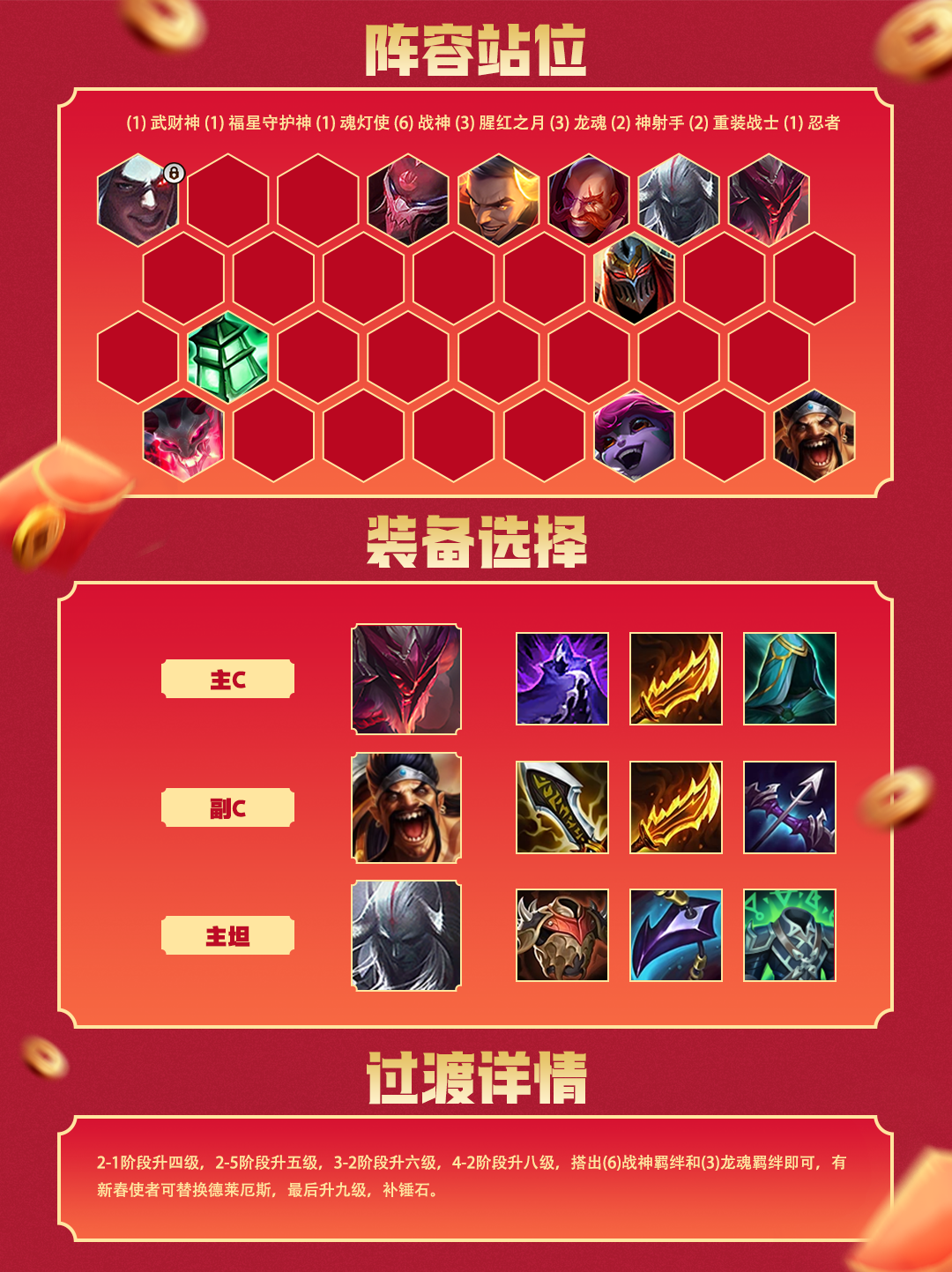 今天就来为大家推荐热门阵容【武财神-德莱文】【福星守护神-烬】【福星守护神-凯隐】! 助力大家春节假期爽玩铲铲!