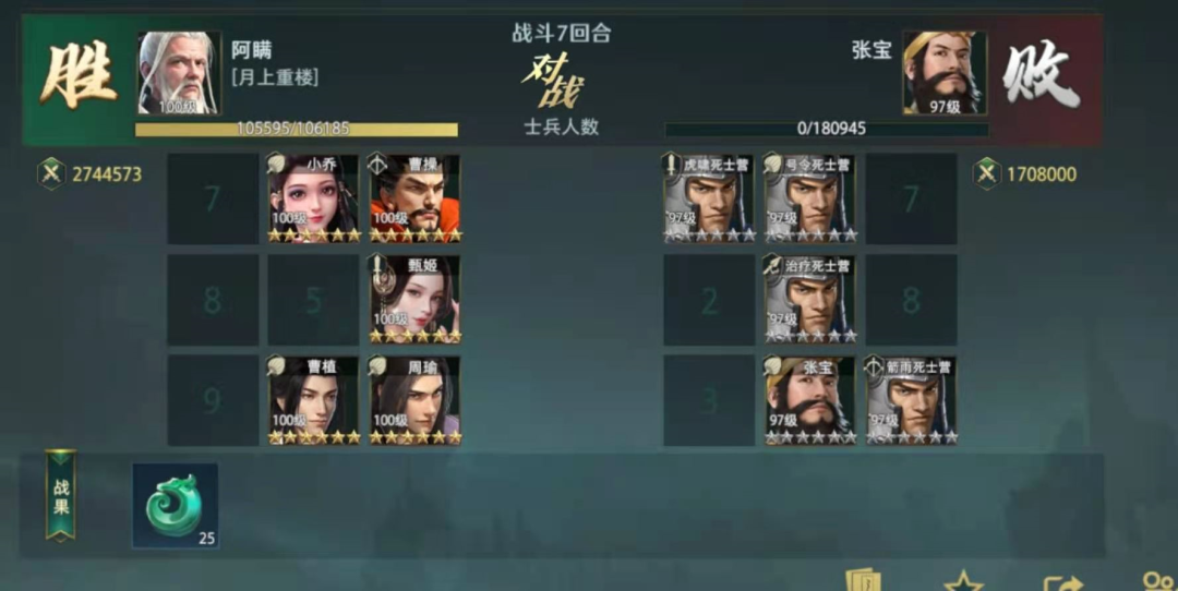 以周瑜为基础组建一支比较容易成型的策攻队,曹操、小乔、曹植提供士气让周瑜轻松打出多轮技能。